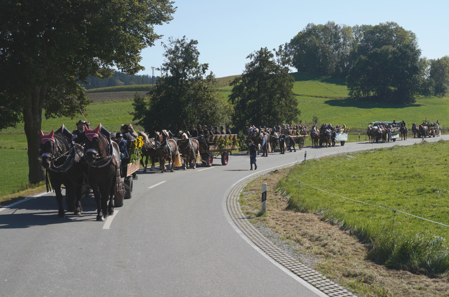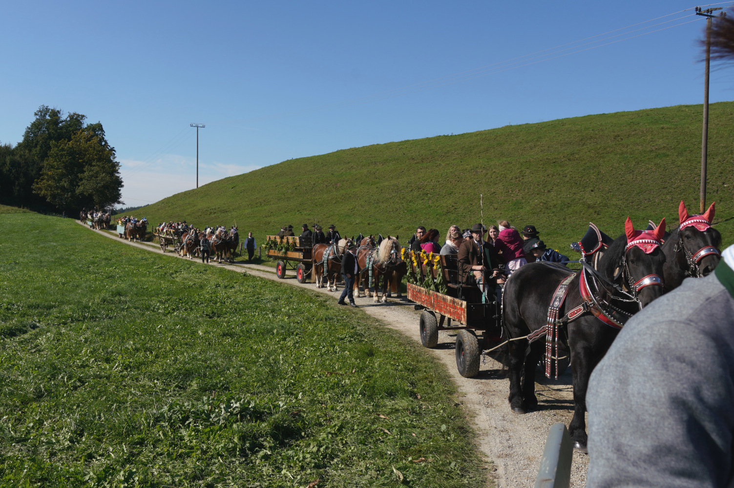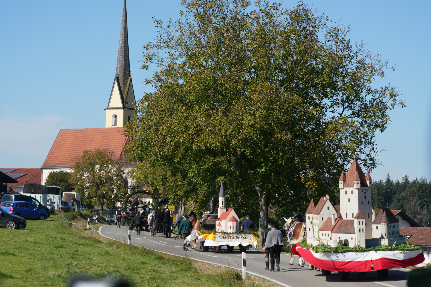 18 Motivwagen und weitere Reitergruppen nahmen an dem Umzug bei bestem Wetter teil. Ein Wagen fuhr unsere Trachtenkindern und einer unsere Alttrachtler und Trachtler.